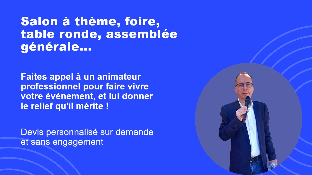 A votre disposition un professionnel de la communication pour l'animation de vos événements : conférence débat, table ronde, colloque, assemblée générale, foire, salon à thème, événement gastronomique...